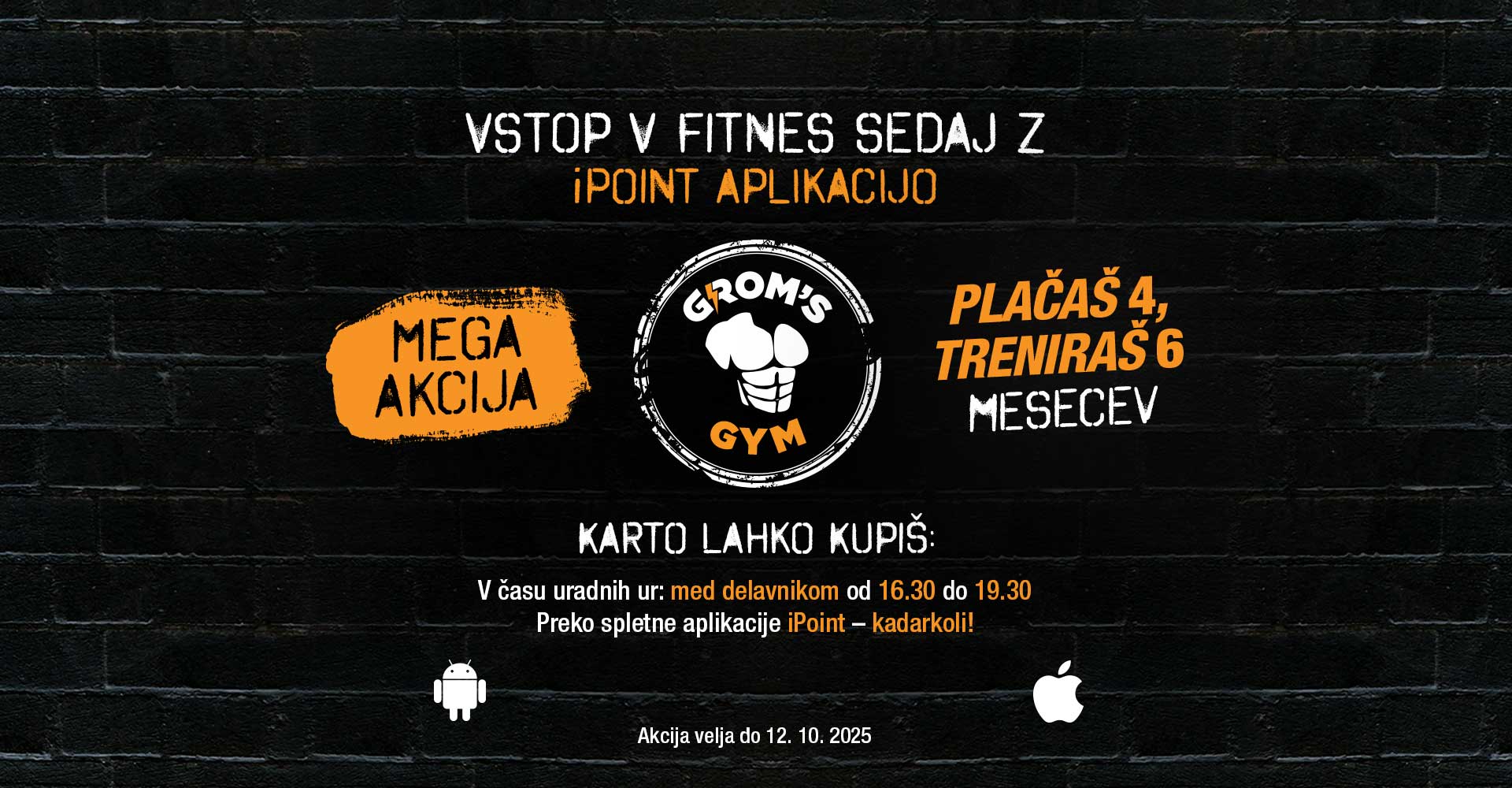 V Grom’s Gymu smo uvedli samopostrežni fitnes sistem iPoint, ki omogoča delovanje centra brez osebja. Za vstop v fitnes morate na svoje mobilne telefone naložiti aplikacijo, ki vam bo za vsak vstop in izstop generirala novo kodo.